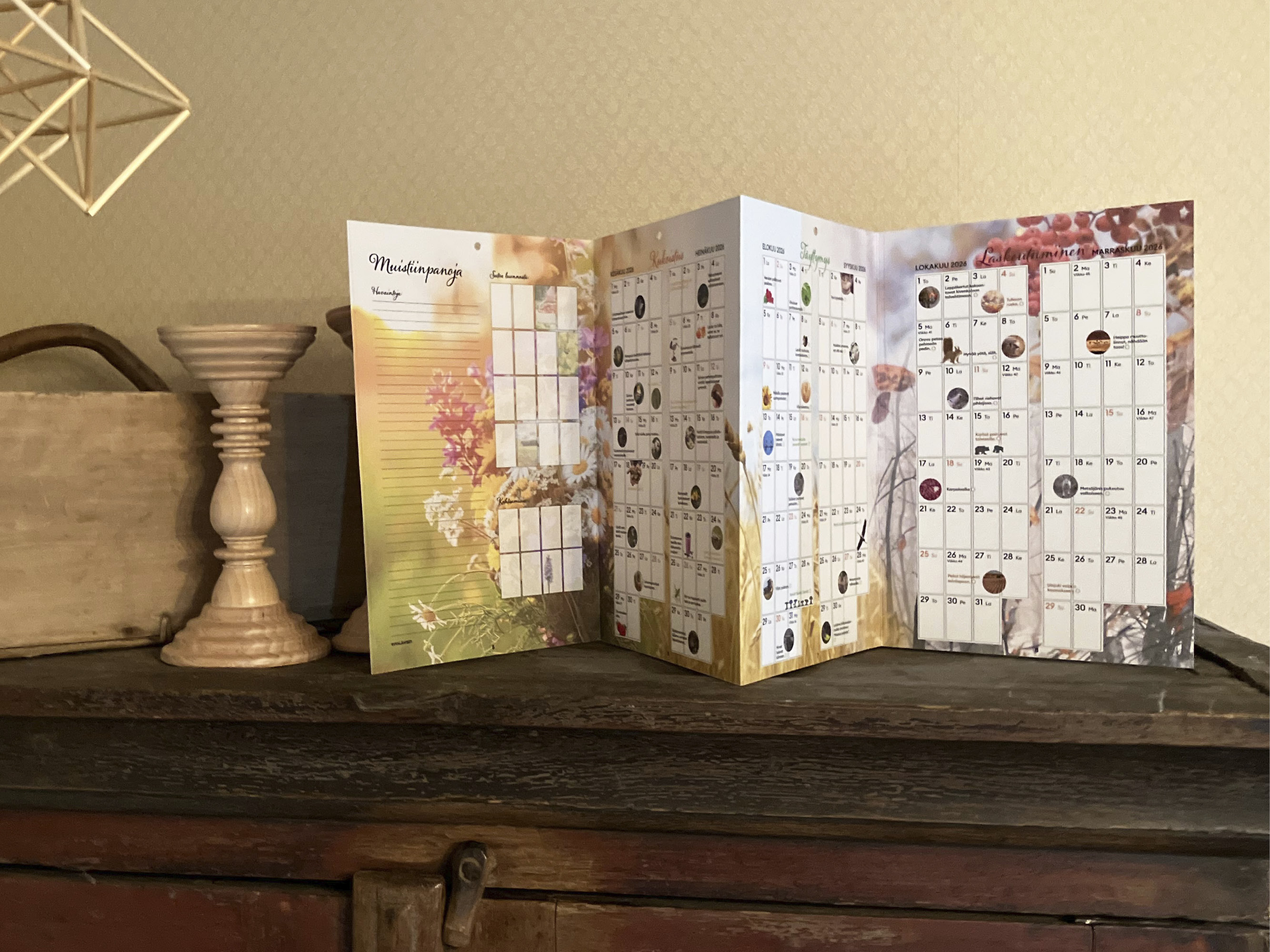 Kalenterin voi pystyttää pöydälle tai hyllylle. Birgitta Salminen