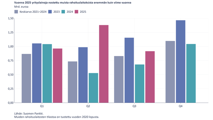 Uusia yrityslainoja nostettiin sekä vuoden 2025 kolmannella neljänneksellä että vuoden alusta syyskuuhun mennessä merkittävästi enemmän kuin vuotta aikaisemmin. Vuonna 2024 yrityslainoja nostettiin muista rahoituslaitoksista vähäisesti.
