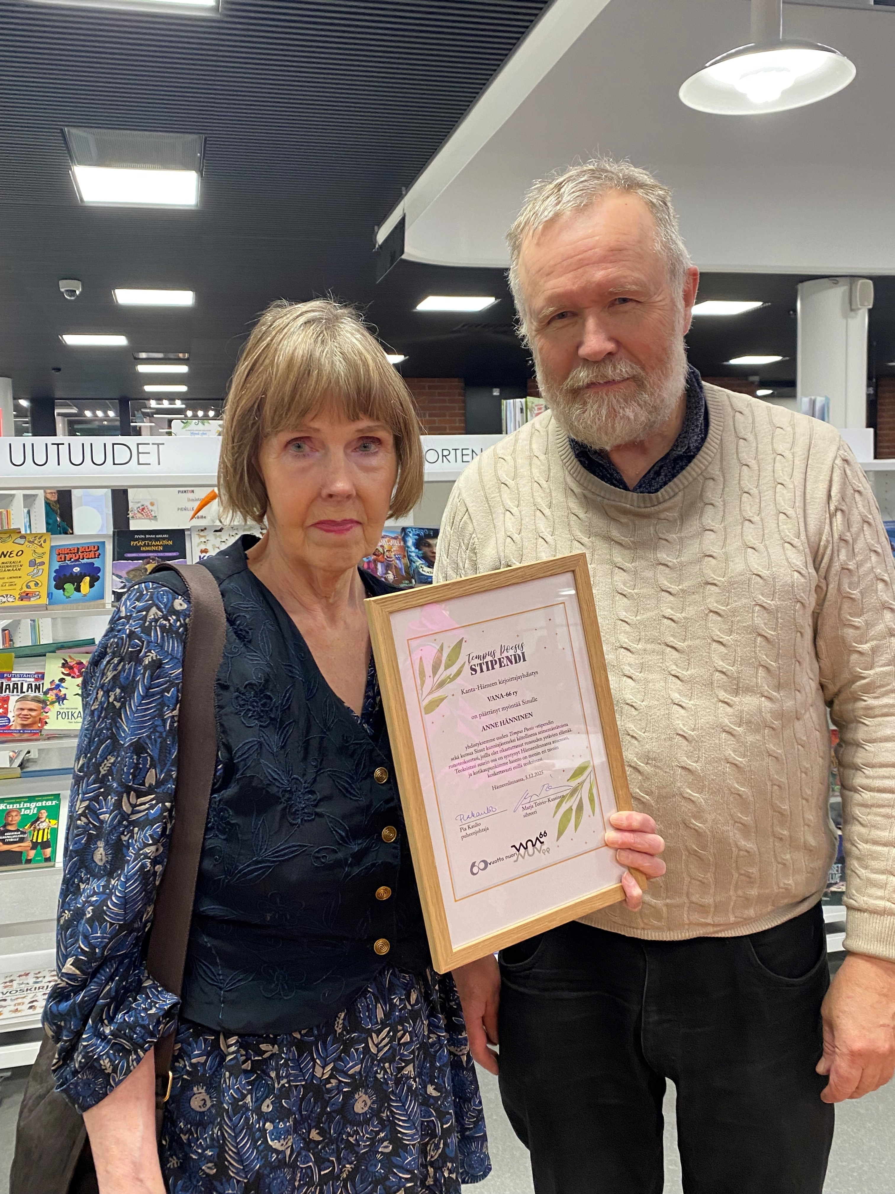 Anne Hänniselle Kanta-Hämeen kirjoittajayhdistys VANA -66 ry:n kunniajäsenyys ja Tempus Poesia -stipendi