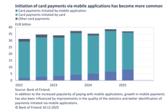 The number of card payments initiated via mobile applications has increased throughout the period covered by the statistics, which began in 2022. In the first half of 2025, a record number of such payments was again made, both in terms of transaction count and value. A total of 334 million payments were made, with an aggregate value of EUR 8.1 billion. Two factors lie behind the growth in mobile-app-initiated payments: first, paying via mobile applications has become more widespread in recent years. Second, improvements in the quality of the statistics have enabled better identification of payments initiated via mobile applications, which has increased the reported total value and refined the subclassification of these payments. The majority of mobile-app-initiated card payments were payments from private individuals to businesses, with a value of EUR 6.1 billion in the first half of 2025. Person-to-person (P2P) card-based mobile payments totalled EUR 1.2 billion.