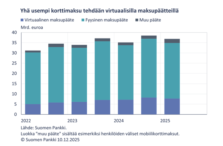 Vuoden 2025 ensimmäisellä puoliskolla tehtiin aiempaa enemmän mobiilisovelluksella käynnistettyjä korttimaksuja, yhteensä 8,1 mrd. euron arvosta. Aiempaa suurempi osa korttimaksuista tehdään virtuaalisilla maksupäätteillä samalla kun fyysisillä maksupäätteillä tehtyjen maksujen osuus on pienentynyt.