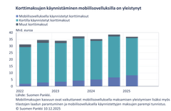 Mobiilisovelluksella käynnistettyjen korttimaksujen määrä on kasvanut koko 2022 alkaneen tilastoinnin ajan, ja vuoden 2025 ensimmäisellä puoliskolla maksuissa tehtiin jälleen ennätys sekä lukumääräisesti että arvolla mitattuna. Maksuja tehtiin 334 milj. kertaa yhteensä 8,1 mrd. euron arvosta. Mobiilisovelluksella käynnistettyjen korttimaksujen kasvun taustalla on kaksi tekijää: Ensinnäkin mobiilisovelluksella maksaminen on yleistynyt viime vuosien aikana. Toisaalta tilastojen laadun parannuttua on mobiilisovelluksella käynnistettyjä maksuja myös tunnistettu paremmin, mikä on kasvattanut mobiilisovelluksella käynnistettyjen maksujen kokonaisarvoa ja tarkentanut niiden alaluokittelua. Suurin osa mobiilisovelluksella käynnistetyistä korttimaksuista oli henkilöiden yrityksille tekemiä maksuja, joita tehtiin 6,1 mrd. euron arvosta vuoden 2025 alkupuoliskolla. Henkilöiden välisiä (P2P) korttipohjaisia mobiilimaksuja tehtiin 1,2 mrd. euron arvosta.