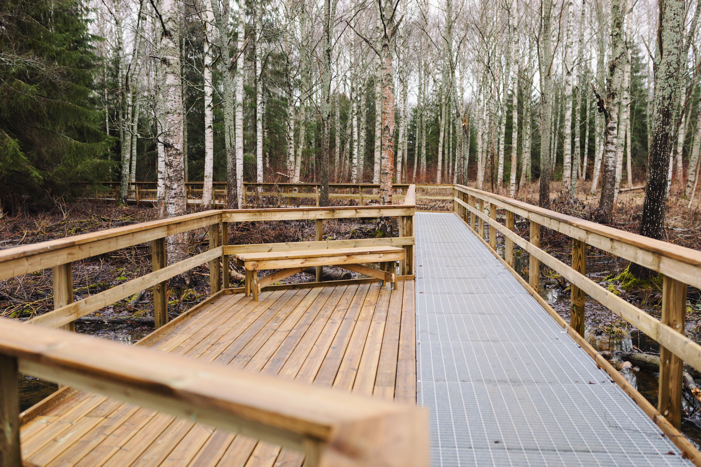 Polku on rakennettu metalliritilöistä ja sen molemmilla puolilla on kaiteet, jotka lisäävät turvallisuutta kaikenikäisille käyttäjille. Lemmikit ovat tervetulleita polulle, mutta metalliritilä voi olla pienille tassuille haastava alusta.