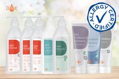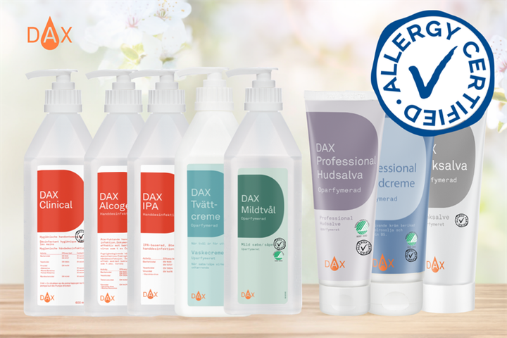 DAX har i över 50 år levererat hygienprodukter som desinfektionsmedel, tvål och krämer till den svenska vårdsektorn. DAX är nu det allra första professionella handdesinfektionsmedlet som får Allergy Certified-märkningen. Detta gör det ännu lättare för användaren att göra ett informerat och säkert val av hygienprodukter i vardagen.