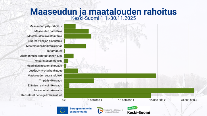 Maaseudun kehittämiseen ja maatalouteen myönnettiin Keski-Suomeen rahoitusta yhteensä 74,2 miljoonaa euroa, joka sisältää mm.