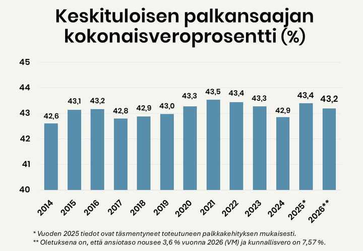 Keskituloisen palkansaajan kokonaisveroprosentti alenee ensi vuonna 43,2 prosenttiin, selviää EVAn laskelmista.