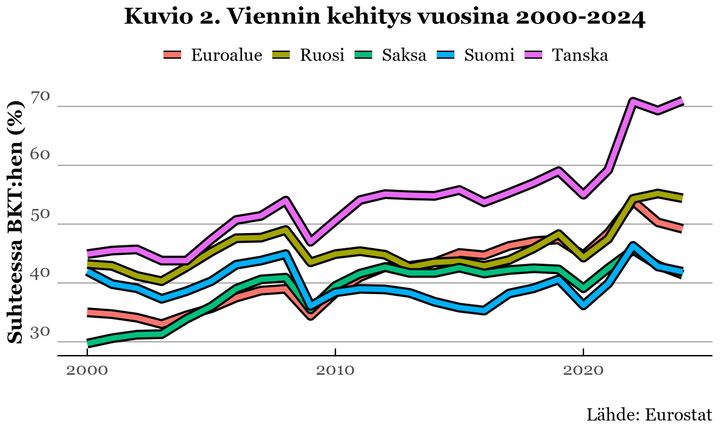 Toiseksi Suomi on avoin talous eli suuri osa täällä valmistetuista tavaroista ja palveluista päätyy kaupaksi ulkomaille. Siispä Suomen talouskasvun hitaus on yhdistetty talouden sulkeutumiseen. Kuvion 1 tarkastelu ei ainakaan kumoa tätä päätelmää, sillä talouskasvu vaikuttaa olevan tiiviissä yhteydessä viennin kasvuun Suomessa ja keskeisissä verrokkimaissa.