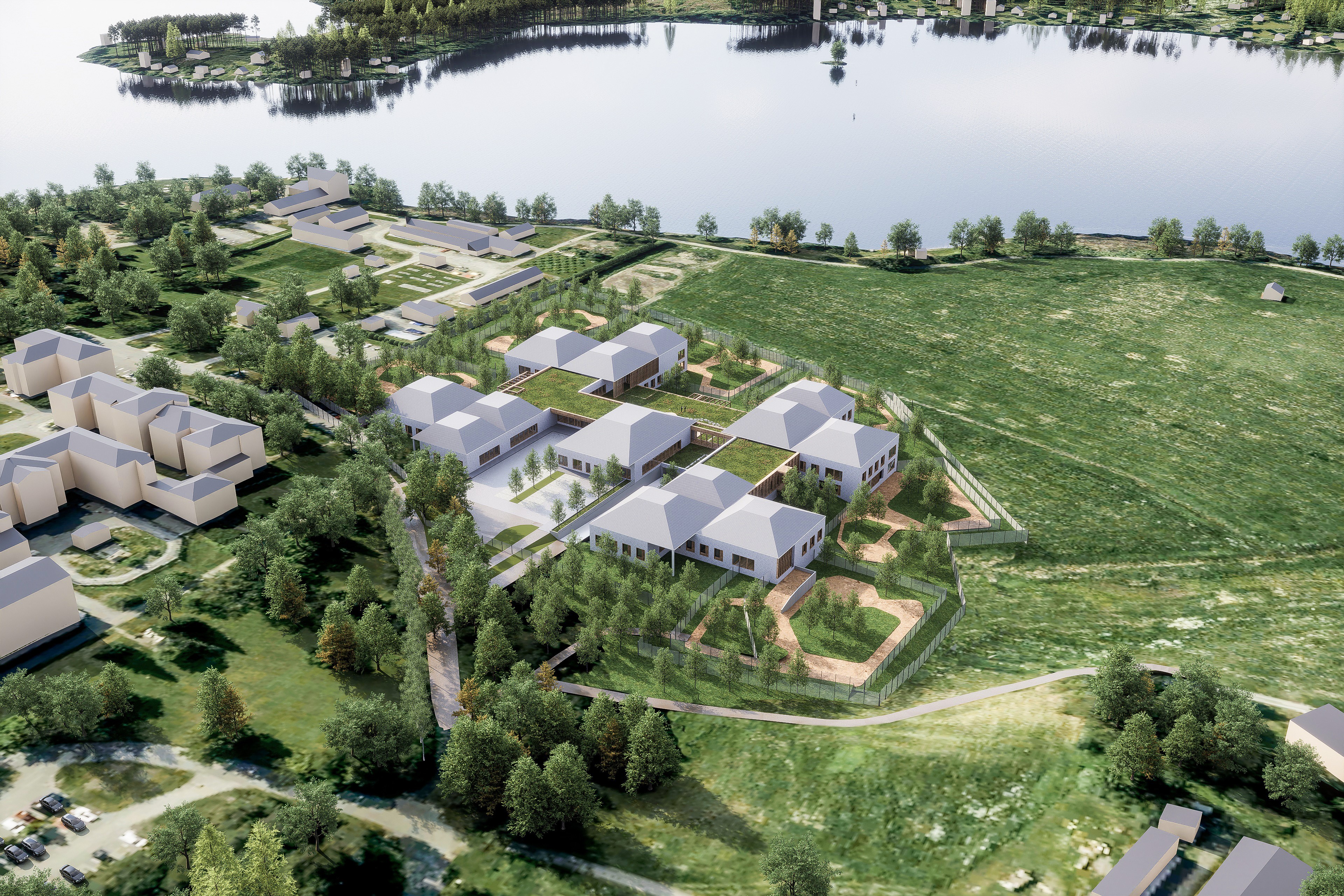 Ilmakuva ehdotuksesta Niityllä, ympäröivinä niittyjä ja metsää. Taustalla järvi.