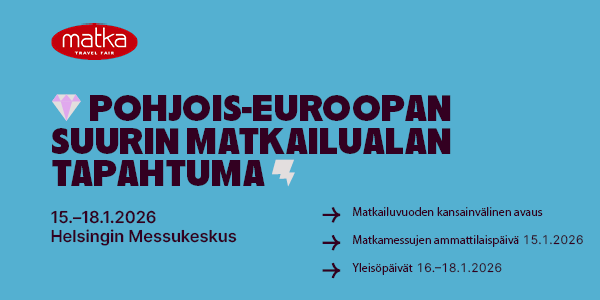 Pohjois-Euroopan suurin matkailualan tapahtuma Matkamessut järjestetään 15.–18.1.2026 Helsingin Messukeskuksessa. Kansainvälinen matkailun ostotapahtuma Matka Workshop Day avaa Matkamessut 14.1.2026. Helsingin Caravan-messut järjestetään 15.–18.1.2026. | www.matkamessut.fi | LinkedIn @matkatravelfair | #Matkamessut #Matka2026 #MatkaTravelFair
