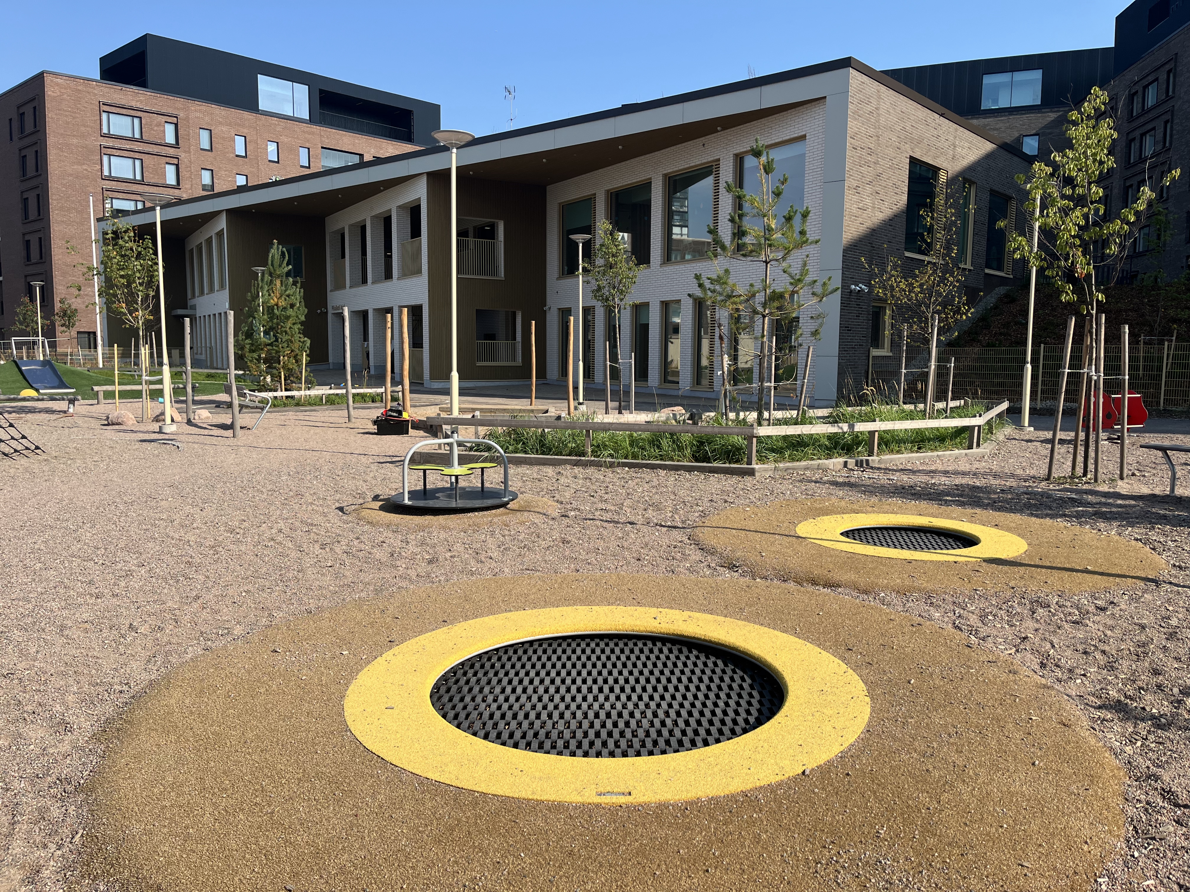 – Yksi keskeisistä asioista ovat laajat ulkokuistit, joiden kautta lasten siirtyminen ulos tapahtuu hallitusti ja vaiheittain. Olemme myös tehneet rakennukselle pientä ja lähestyttävää mittakaavaa pilkkomalla julkisivua useaan osaan. Ulkotilojen ja pihan suunnitteluun on panostettu, sillä pihaa käyttävät paljon myös ympäröivien talojen asukkaat.