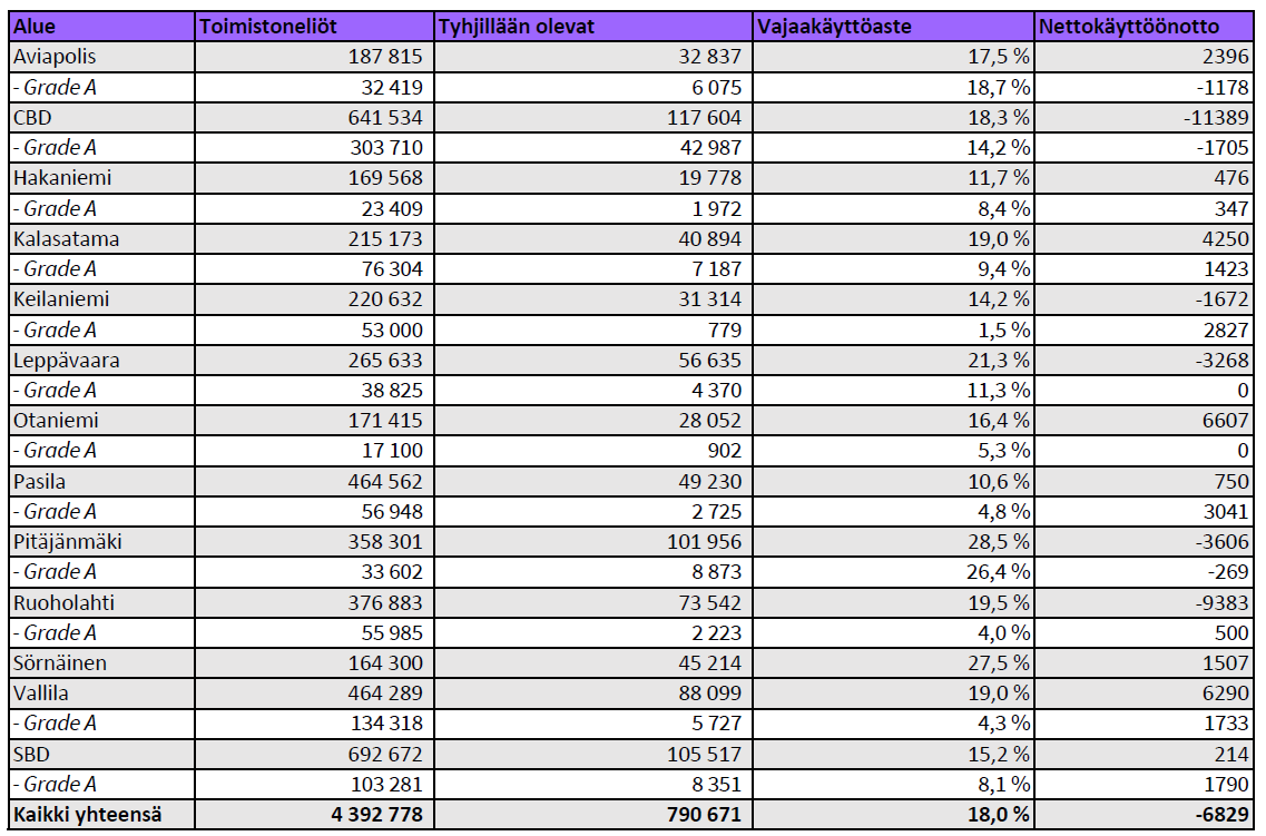 Pääkaupunkiseudun keskeisillä toimistoalueilla oli joulukuun 2025 lopussa tyhjää toimistotilaa 791 000 neliömetriä. Keskimääräinen vajaakäyttöaste oli 18,0 prosenttia. Vajaakäyttö väheni merkittävästi Otaniemessä ja nousi Ruoholahdessa. Grade A -toimistojen keskimääräinen vajaakäyttöaste on noin 9,9 prosenttia.