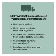”Kuljettajan tieto lastista on usein vähäinen, tiedonkulku toimijoiden välillä on katkonaista ja vastuut epäselviä. Viranomaisilla on hyvin rajalliset resurssit vaarallisten kuormien tarkastamiseen matkan varrella”, Veijola jatkaa.