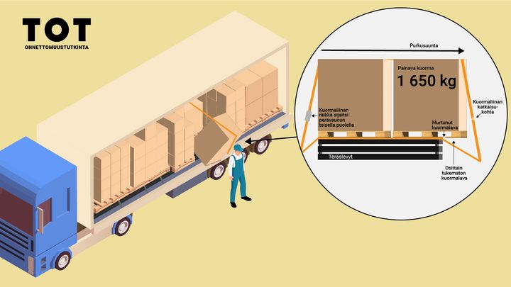 Kuorma-auton kuljettaja oli ajanut satamasta puoliperävaunun kuljetusyrityksen jakeluterminaaliin. Kuormassa oli alimpana teräslevyjä sekä niiden päälle sijoitettuna muuta kuormaa, muun muassa kaksi 1650 kiloa painavaa lastulevyjä sisältänyttä kuormalavaa.