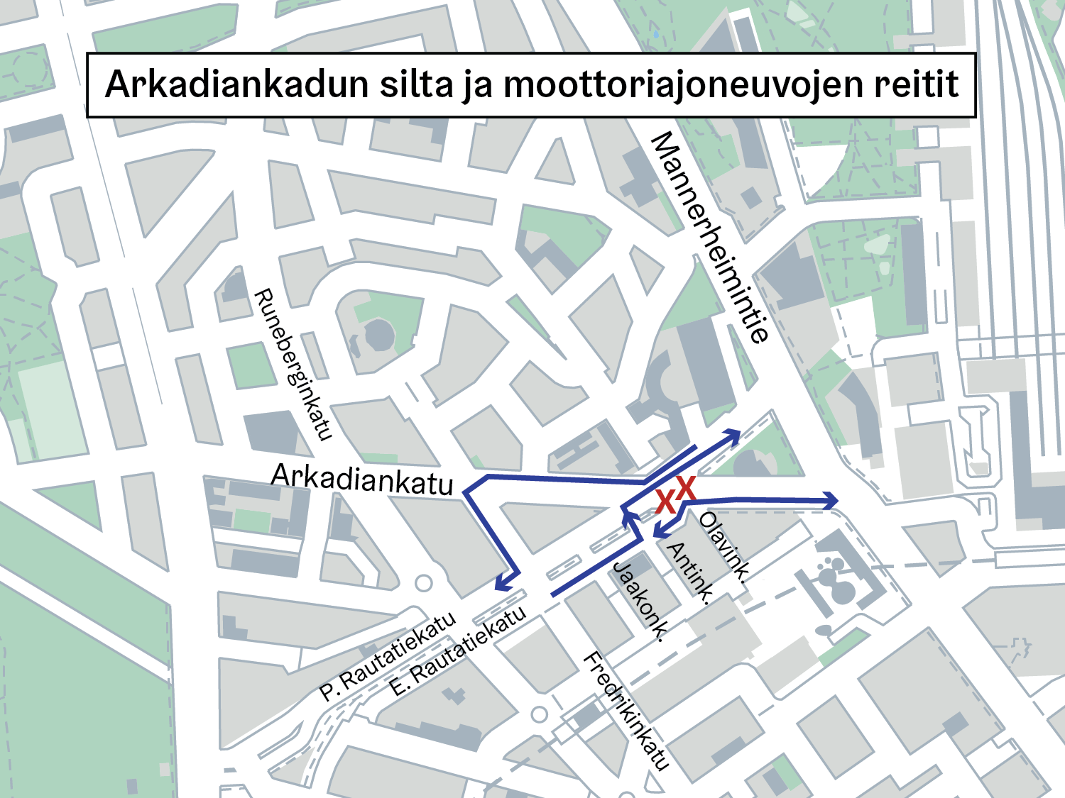 - Pohjoinen Rautatiekatu muuttuu yksisuuntaiseksi Mannerheimintien suuntaan sillan kohdalla. Länteen päin kulkeva kiertoreitti kulkee Arkadiankadun ja Fredrikinkadun kautta.