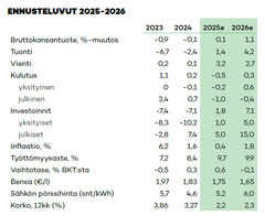 Suomen bruttokansantuotteen kasvu jää tänä vuonna supistuvan yksityisen kulutuksen painamana hyvin vaatimattomaksi, vain 0,1 prosenttiin. Ensi vuoden puolen välin tienoilla talousnäkymät alkavat kirkastua Euroopan kiihtyvän talouskasvun vanavedessä. Yksityinen kulutus kääntyy kasvuun ja investointikysyntä vahvistuu, erityisesti puolustussektorin panostusten myötä. Vuonna 2026 talouden ennakoidaan kasvavan 1,1 prosenttia.