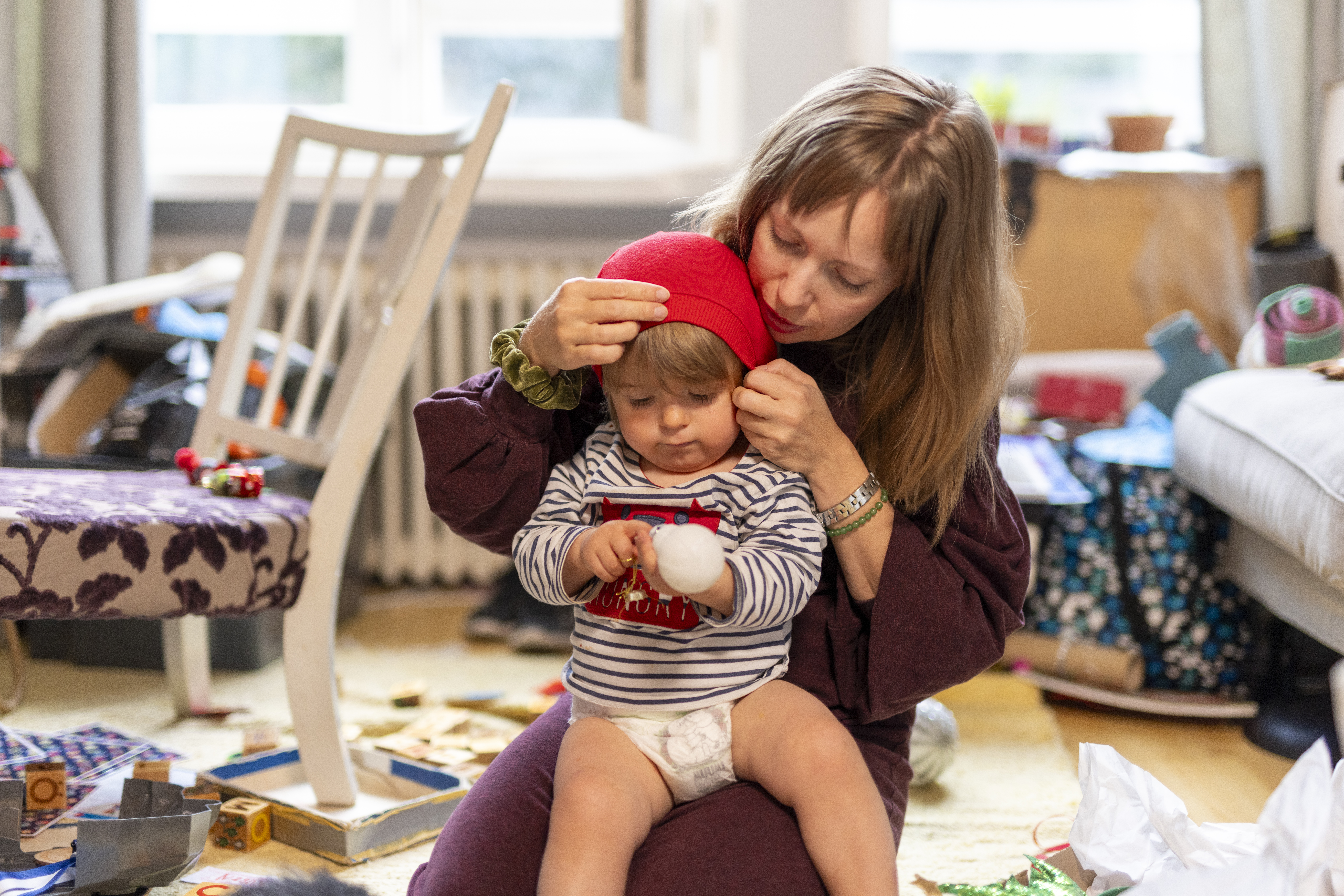 Lapsi istuu naisen sylissä lattialla.