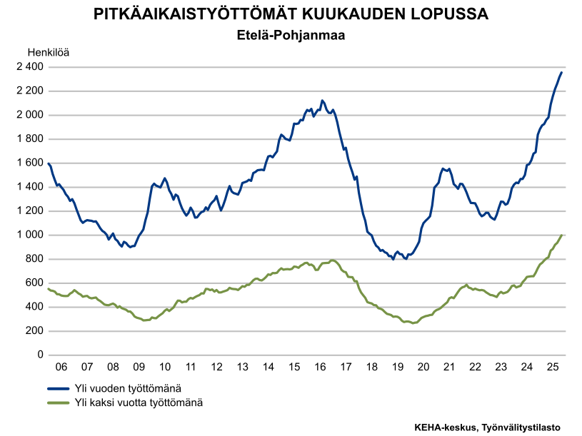 Pitkäaikaistyöttömien määrä on kasvanut Etelä-Pohjanmaalla merkittävästi. Kaikista alueen työttömistä työnhakijoista pitkäaikaistyöttömiä oli hieman vajaa kolmannes. Samanaikaisesti nuorisotyöttömyys on lisääntynyt ja avoimia työpaikkoja on tarjolla entistä vähemmän.