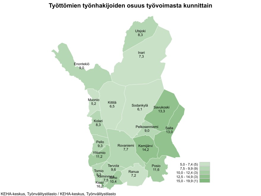 Työttömien osuudessa työvoimasta on suuria eroja Lapin kuntien välillä. Alimmillaan työttömien osuus työvoimasta marraskuussa oli Muoniossa (5,2 %), Sodankylässä (6,1 %) ja Kittilässä (6,5 %). Korkeimmat lukemat kirjattiin Kemissä (16,2 %) ja Kemijärvellä (14,2 %). Työttömien osuudessa työvoimasta oli eroa siis jopa 11 prosenttiyksikköä.