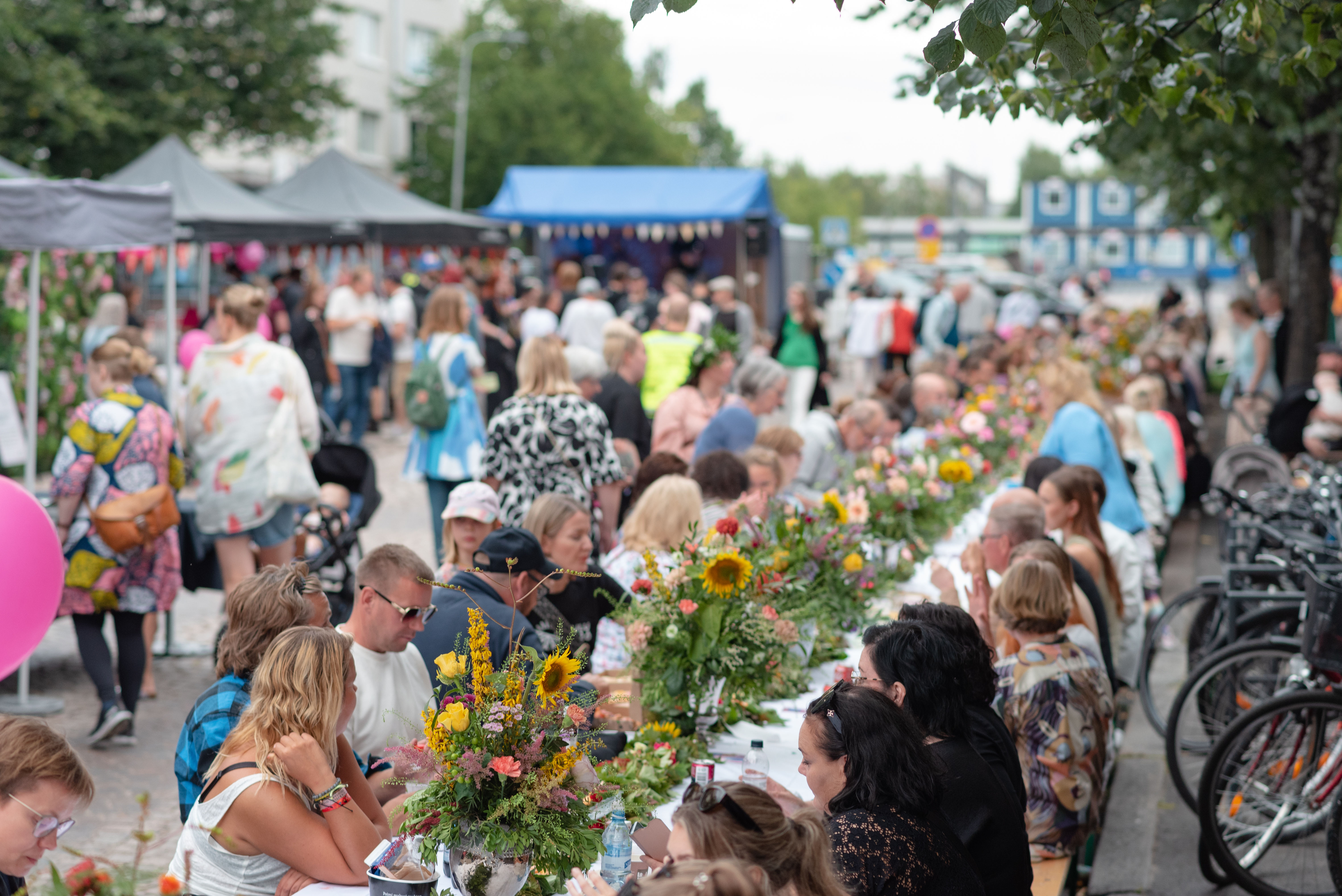 Kuvassa suuri joukko ihmisiä istuu pitkän pöydän ääressä ulkona Kesäillan kattaus -tapahtumassa Oulussa kesällä 2024. Pöydät on koristeltu kukilla.