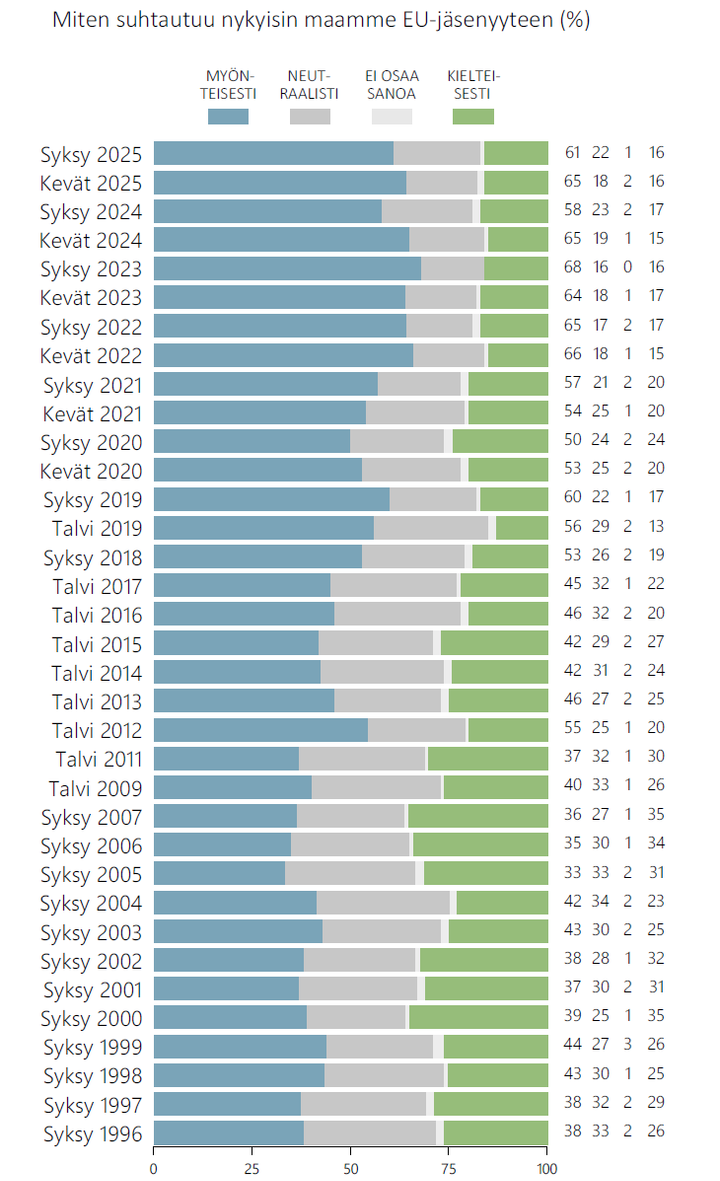 EU-jäsenyyteen suhtautuu myönteisesti 61 prosenttia suomalaisista, neutraalisti 22 prosenttia ja kielteisesti 16 prosenttia. EU-myönteisyys on säilynyt viime vuosien korkealla tasolla, eikä EU-kielteisyys ole kääntynyt kasvuun.