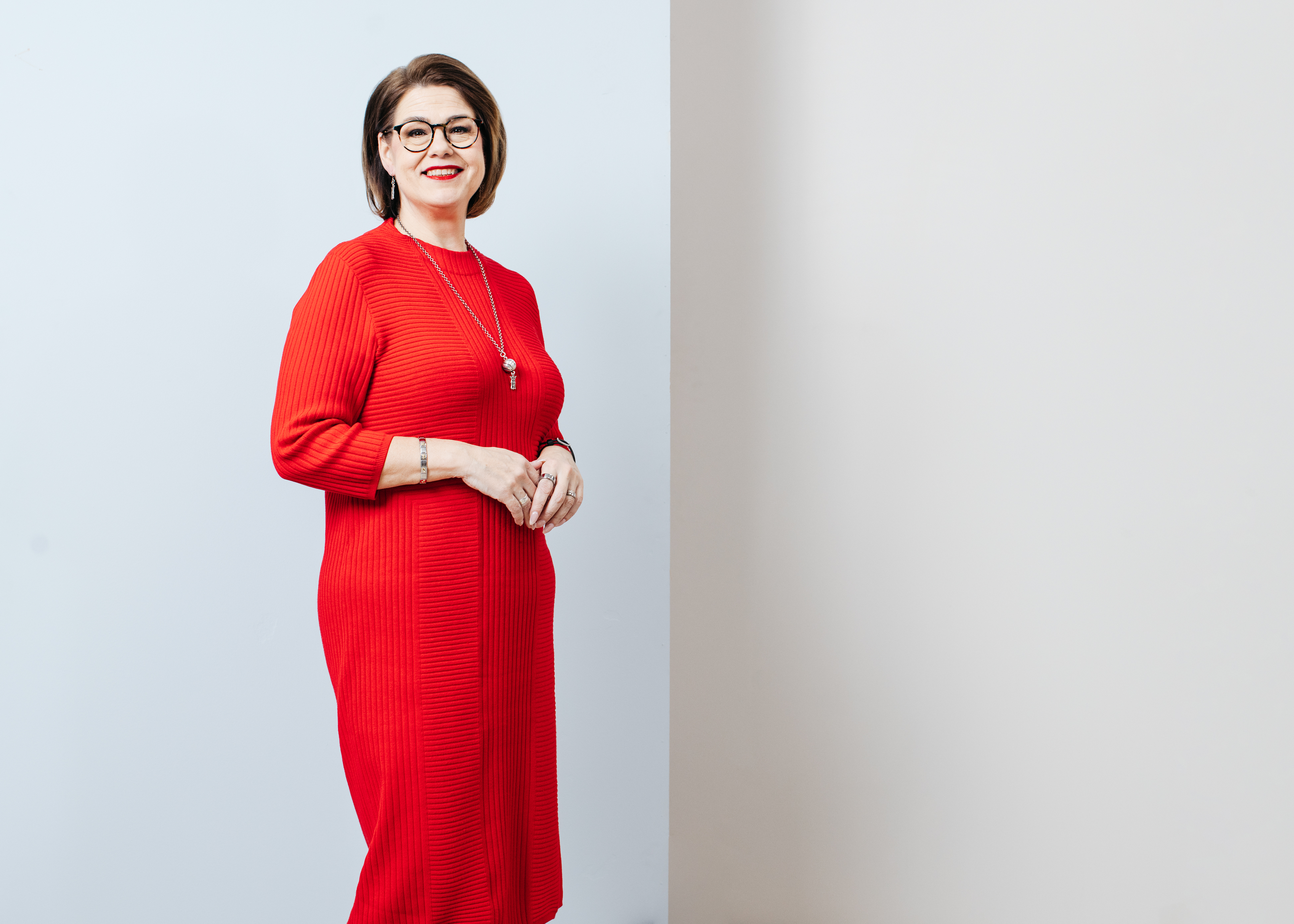 Nainen punaisessa mekossa.