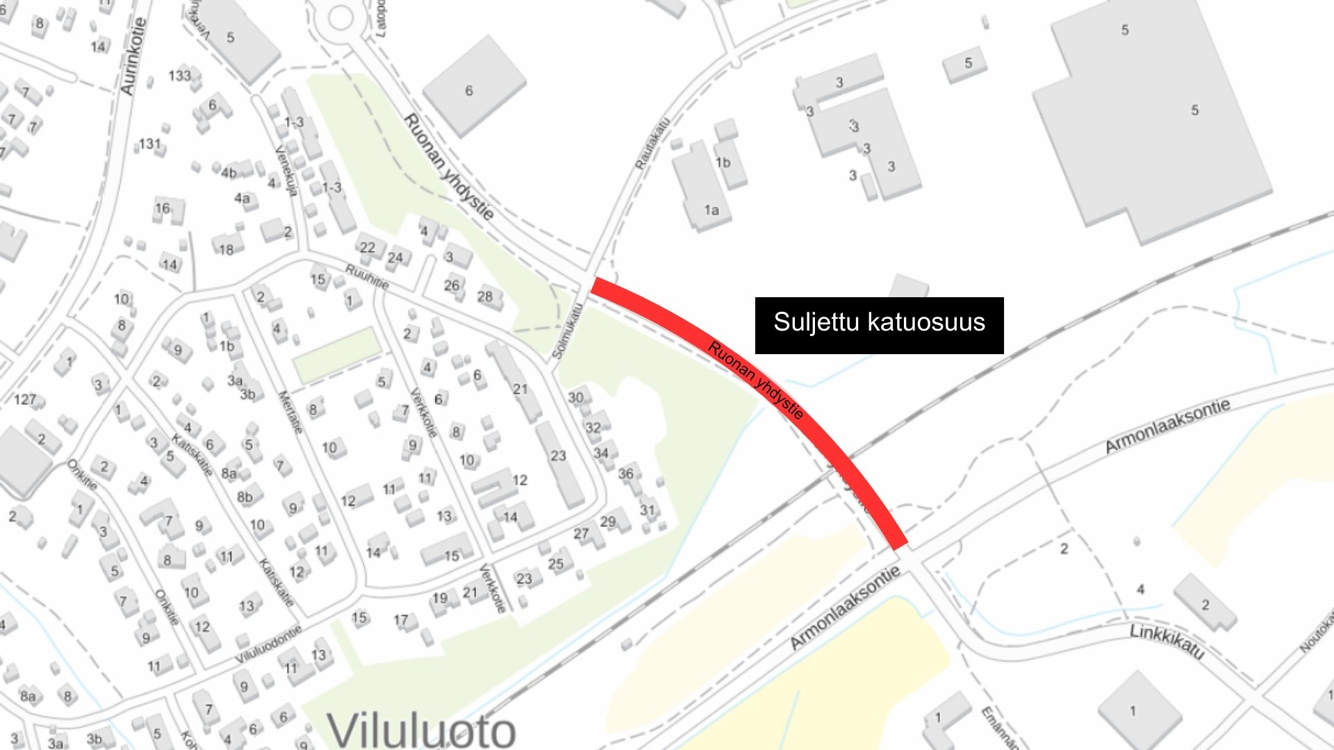 Sulku alkaa tiistai-iltana 20.1. klo 20.00 ja päättyy keskiviikkoaamuna 21.1. klo 6.00. Ruonan yhdystiellä ja Rautakadulla on parhaillaan käynnissä kiertoliittymän rakennustyöt ja vesihuoltoverkoston parannustöitä. Liikennekatkon aikana tehdään muun muassa putkien kaivutöitä ajoratojen kohdalla.