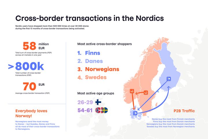 Suomalaiset lähettävät rahaa useimmin norjalaisille ja maksavat tyypillisimmin tanskalaisille kauppiaille. Vastavuoroisesti rahaa saapuu Suomen suuntaan eniten norjalaisilta, seuraavaksi tanskalaisilta ja vähiten ruotsalaisilta.