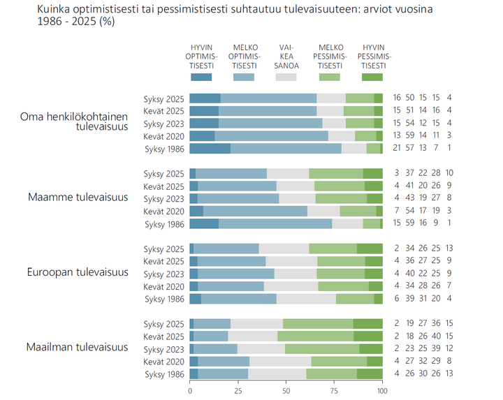 Samaan aikaan, kun Suomi on ollut menossa enemmistön mielestä väärään suuntaan, myös näkemys maamme tulevaisuudesta on muuttunut aiempaa pessimistisemmäksi. Enää 40 prosenttia suhtautuu Suomen tulevaisuuteen optimistisesti, kun pessimistisesti suhtautuvia on lähes yhtä paljon (38 %). Sen sijaan omaan henkilökohtaiseen tulevaisuuteen suhtaudutaan edelleen selvästi valoisammin: kaksi kolmasosaa (66 %) on omasta tulevaisuudestaan optimistisia ja vain viidesosa (19 %) pessimistisiä.