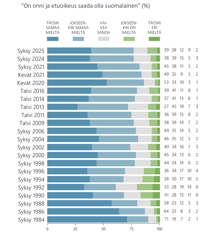 Tästä huolimatta yli kolme neljästä (77 %) pitää onnena ja etuoikeutena saada olla suomalainen. Vain kymmenesosa (11 %) ei koe suomalaisuutta etuoikeutena.