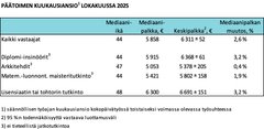 Diplomi-insinöörin mediaanipalkka nousi 3,2 prosenttia edellisvuodesta ja diplomi-insinöörin ostovoima koheni vuoden aikana. Myös edellisvuonna 2024 diplomi-insinöörin ostovoima parani, mutta vuosina 2023 ja 2022 reaalipalkat laskivat.