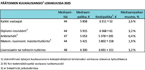 Tekniikan akateemiset TEKin työmarkkinatutkimuksen mukaan vuoden 2025 aikana valmistuneiden diplomi-insinöörien mediaanipalkka oli 4 000 ja keskiarvopalkka 4 193 euroa.