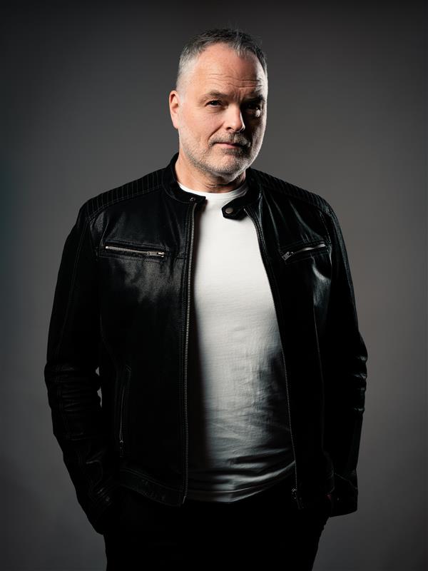 Mies mustassa nahkatakissa ja valkoisessa paidassa harmaata taustaa vasten.