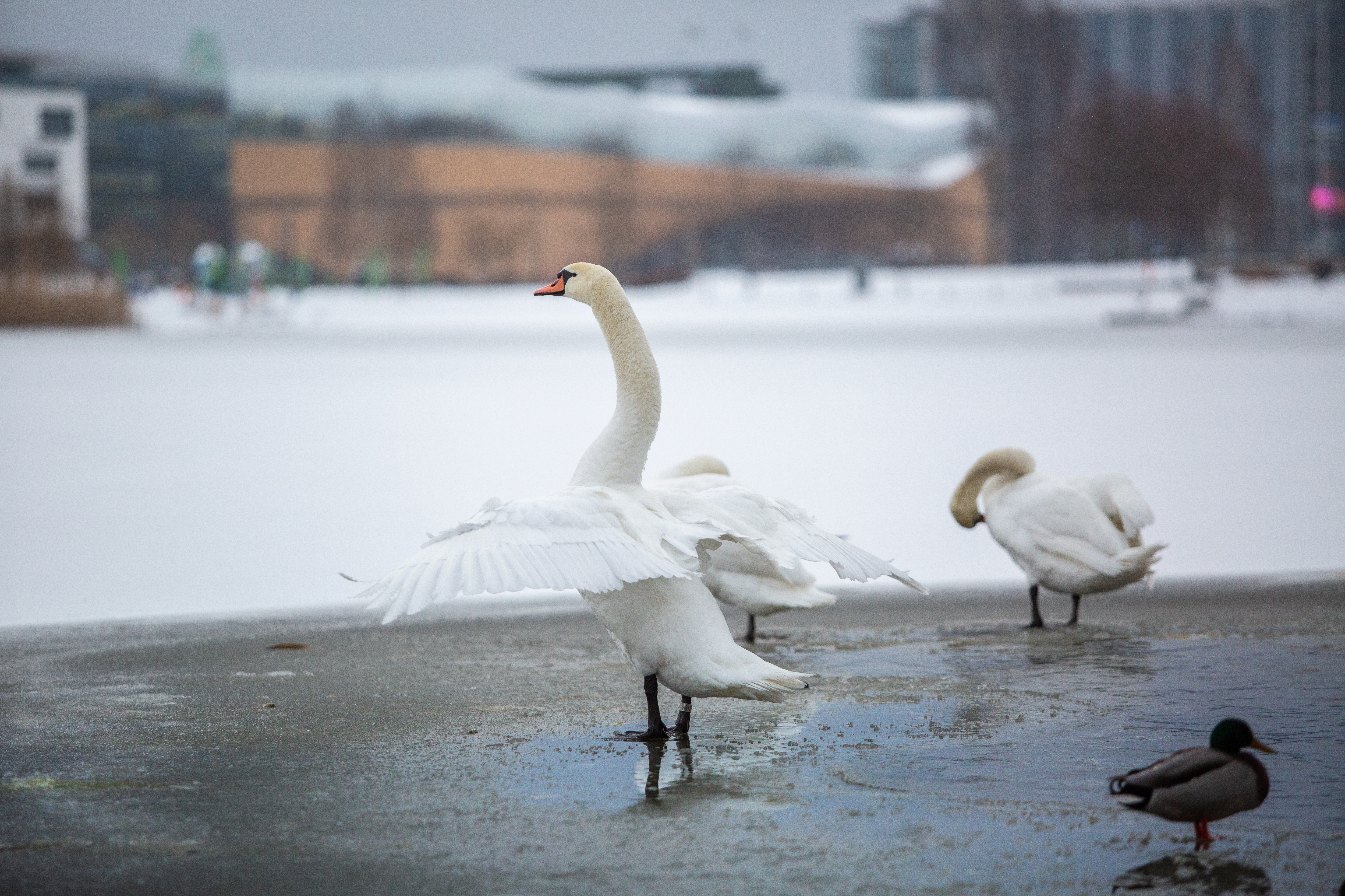 Kolme vesilintua talvisessa maisemassa Töölönlahdella.