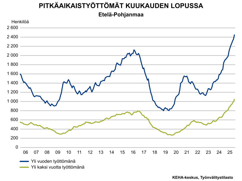 Etelä-Pohjanmaan työvoimasta noin joka kymmenes on työtön. Pitkäaikaistyöttömyys jatkaa edelleen merkittävää kasvua ja yli tuhat työnhakijaa on ollut työttömänä jo yli 2 vuotta. Työttömyys on kasvanut eniten nuorissa ja lähempänä eläkeikää olevien ikäryhmissä.