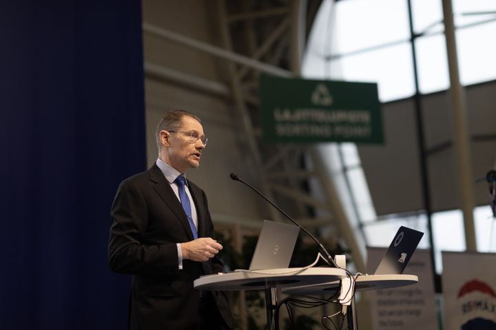 Lavalla puhumassa Hallberg-Rassyn omistaja ja toimitusjohtaja Magnus Rassy. Esitys on englanninkielinen, Maritim-lava