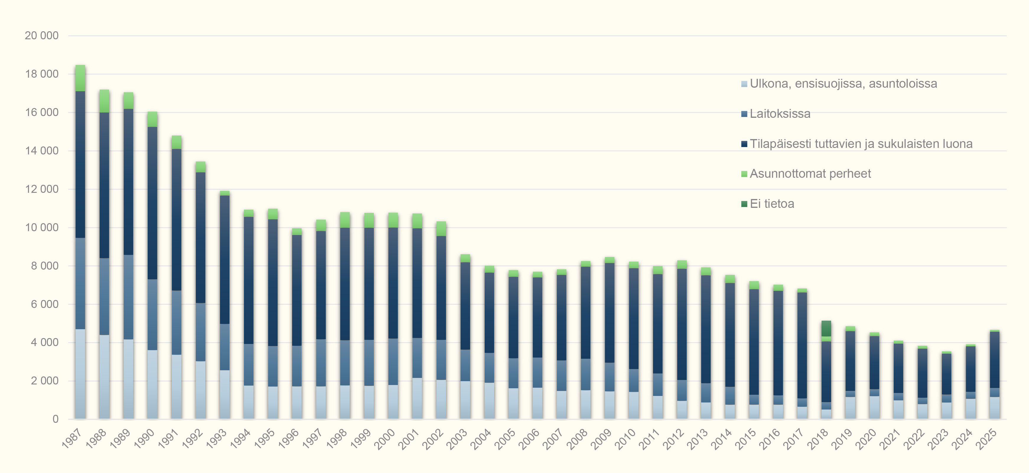 Yksineläviä asunnottomia on nyt 4 579, ja kokonaisasunnottomuus kasvoi vuodessa 20 prosenttia. Edellinen merkittävä kasvu nähtiin vuonna 2024, jolloin yksinelävien asunnottomien määrä lisääntyi 11 prosenttia eli 377 henkilöllä. Sitä edeltävä huippuvuosi oli 2008, jolloin kasvu oli 5,7 prosenttia eli 430 henkilöä.