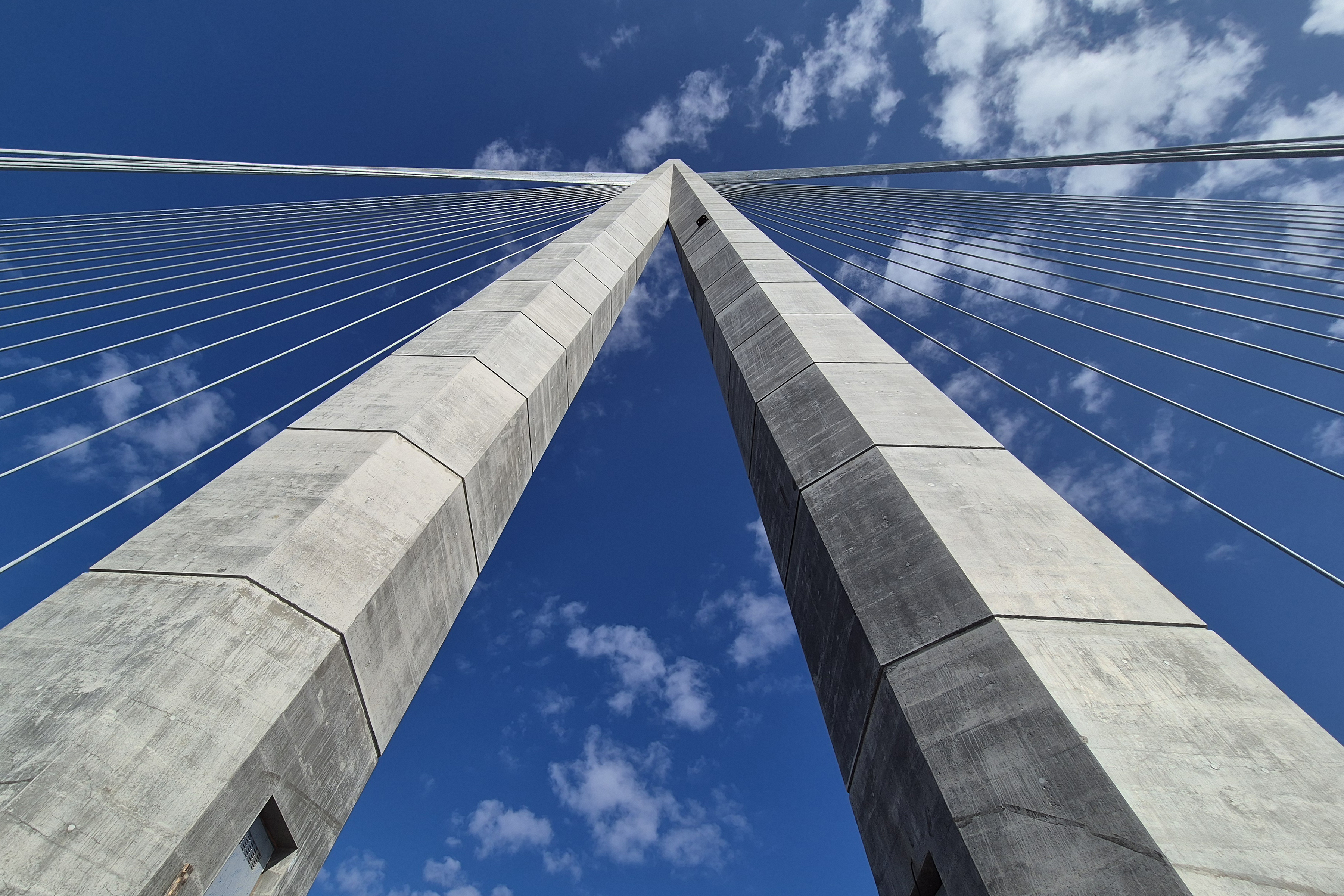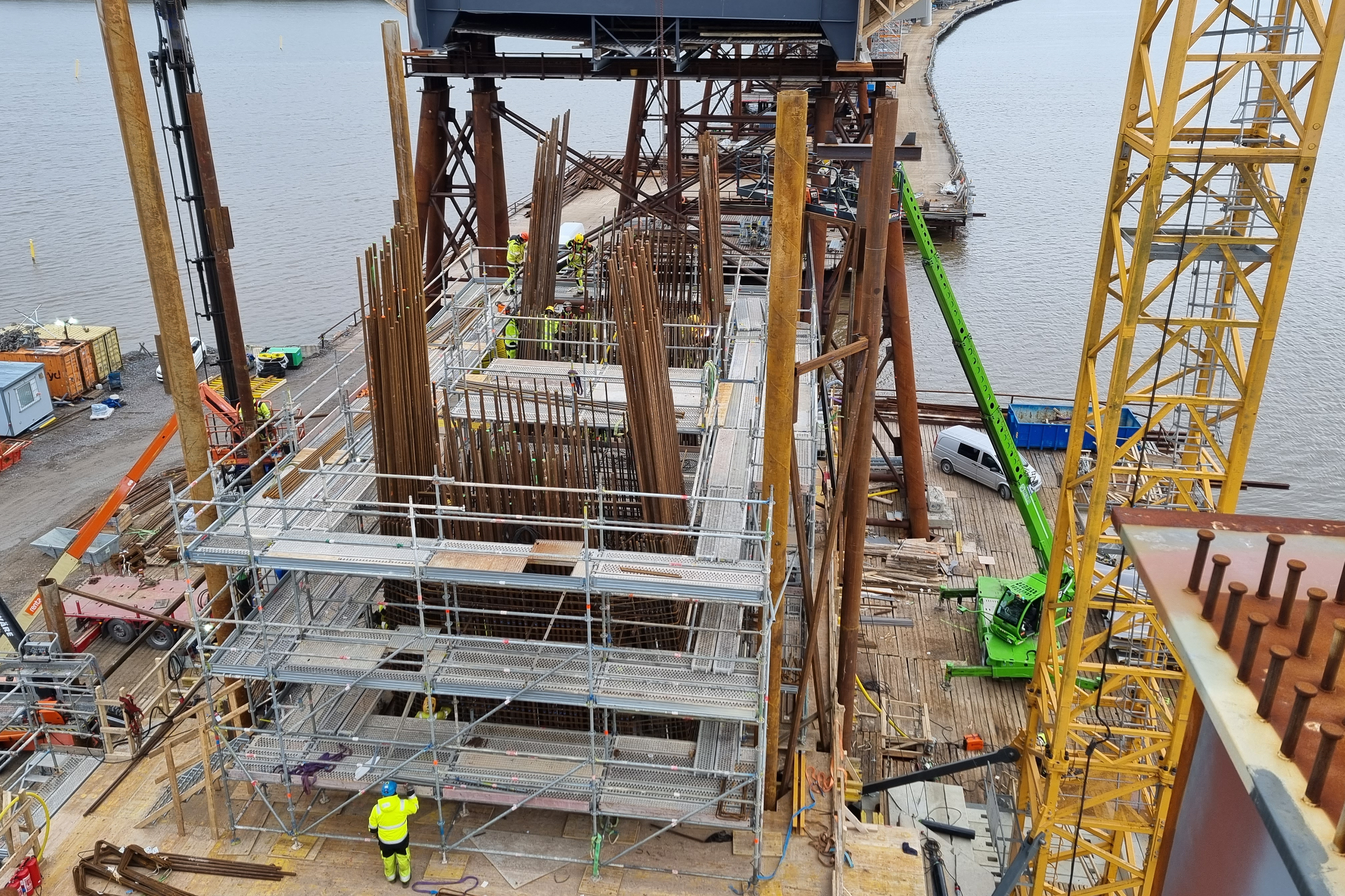 – Kannen teräsrakenteen ja pylonin toisiinsa yhdistävä sidepalkki oli yksi työmaan vaativimmista betonoinneista, sillä sen rakenne oli poikkeuksellisen tiheästi raudoitettu ja jännitetty. Lisäksi kannen teräspalkit lävistivät sidepalkin, mikä toi vinoköysiosuuden kuormia suoraan pylonin jalkaan. Näiden rakenteellisten vaatimusten takia betonointien ennakkovalmisteluihin panostettiin poikkeuksellisen paljon ja toteutus onnistui erinomaisesti, Humalajoki kuvailee.