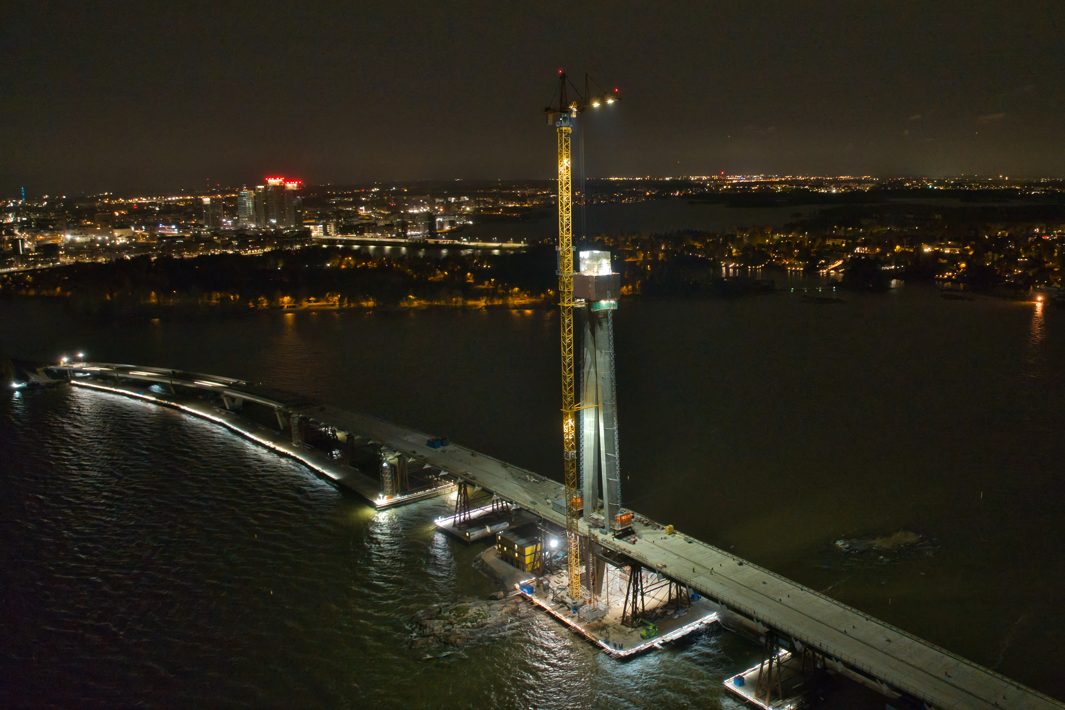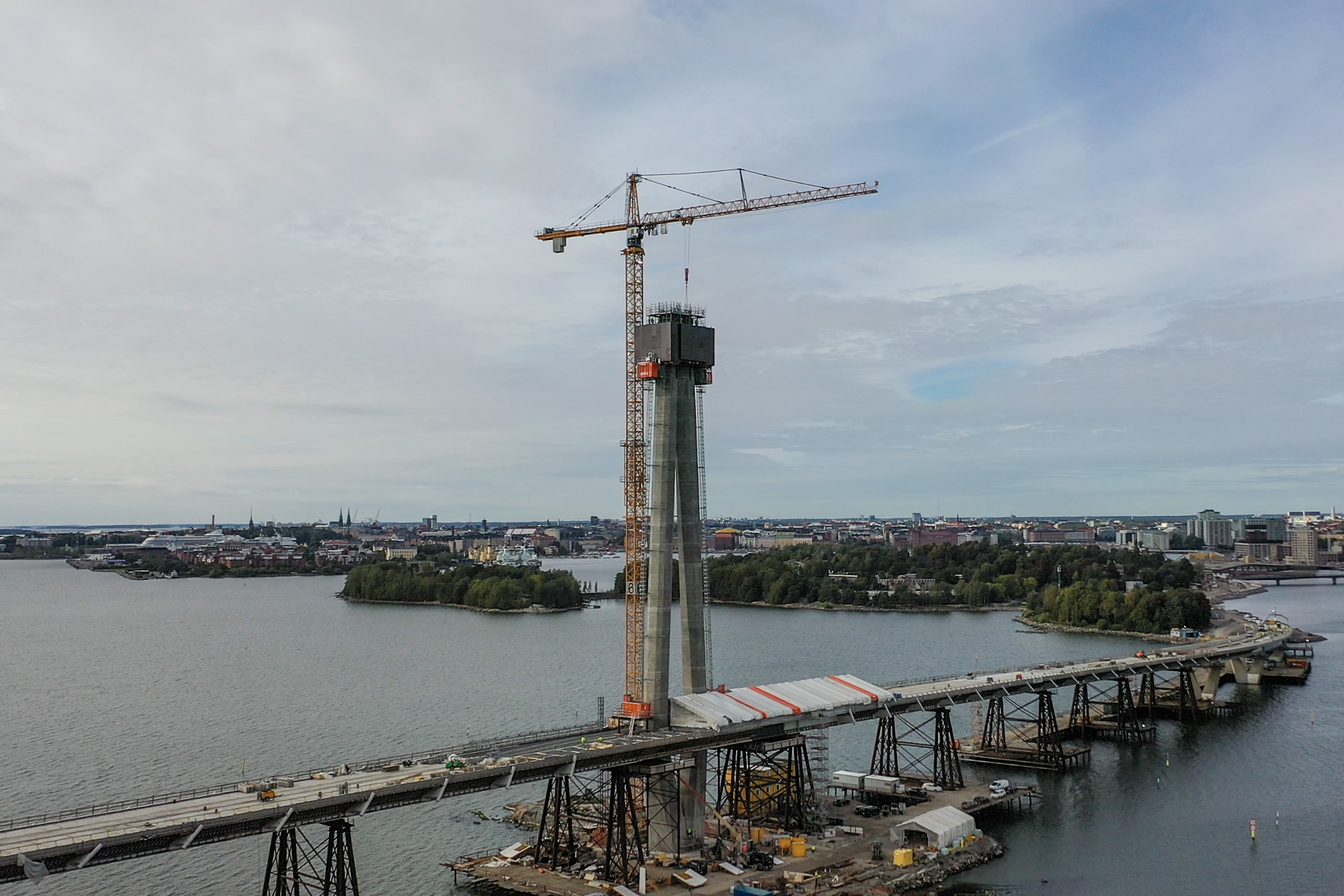 Ilmakuva Kruunuvuorensillasta syyskuussa 2024. Keskiössä on korkea, rakenteilla oleva pyloni nosturin vieressä.