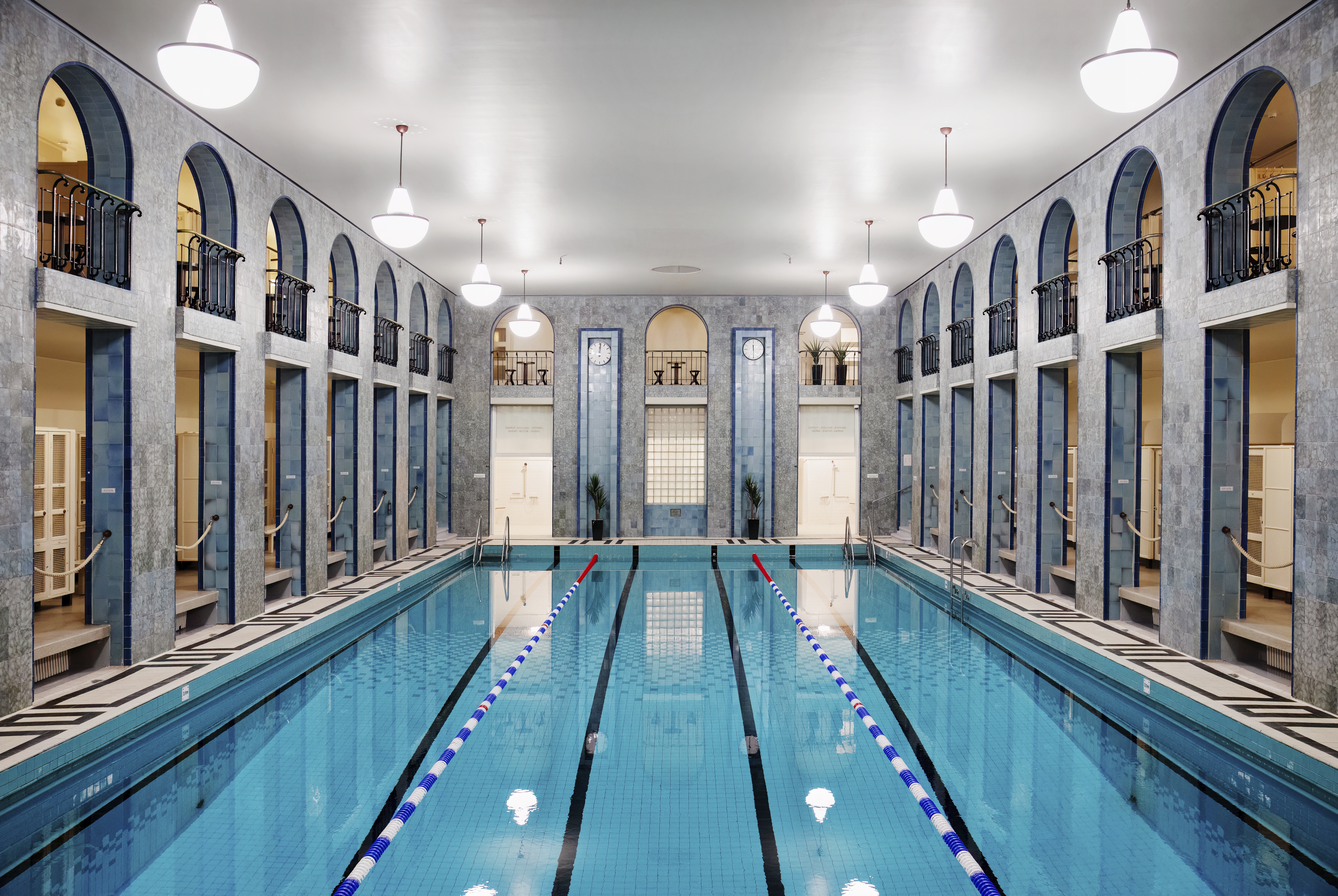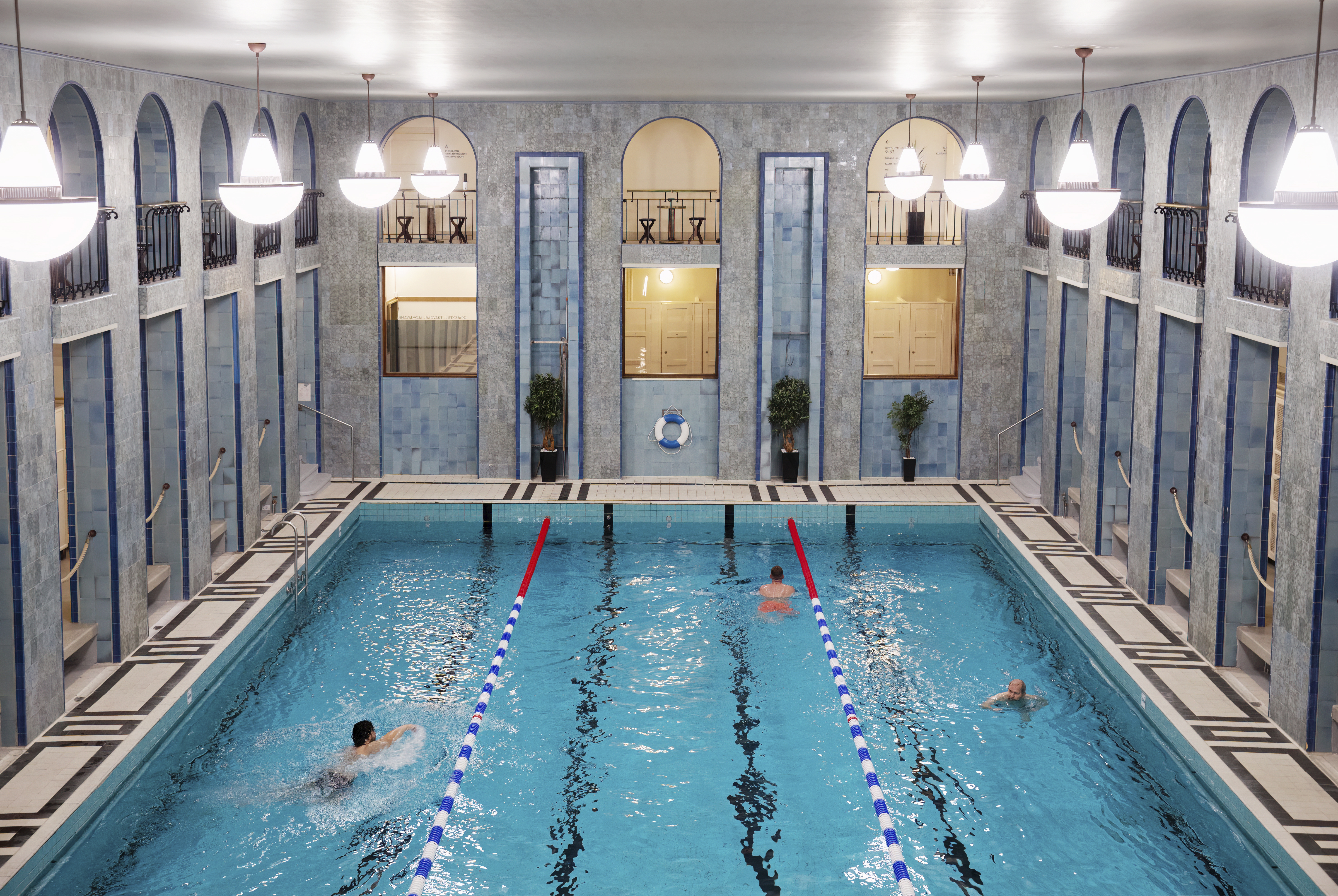 En blåskimrande simhallsvy öppnar sig mellan nyklacissicistika pelare som sträcker sig i två våningar. Simbassängen glittrar och det simmar några personer i den. Vackra lampor syns i den övre våningen.