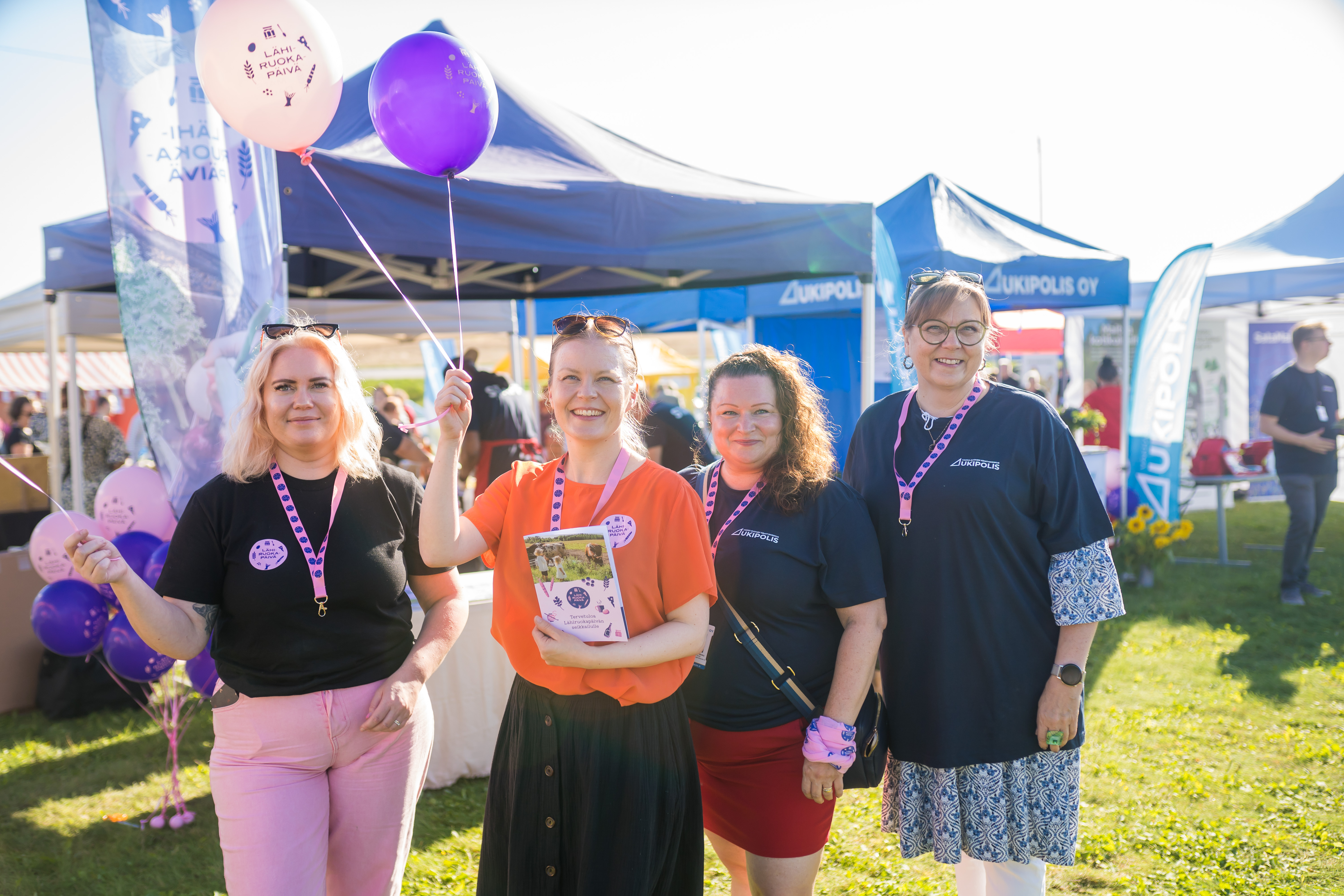 Neljä ihmistä, joilla on kädessään Lähiruokapäivän ilmapalloja.