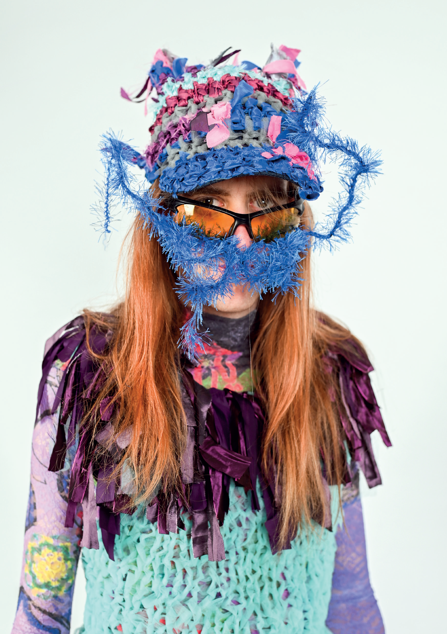 Juha Vehmaanperä (b. 1993) creates garments by knitting and crocheting, combining traditional handicraft techniques with contemporary themes and technologies through experimentation. Their exuberant and abundant designs go beyond practical clothing needs and challenge gender norms, consumer culture and visual expectations.