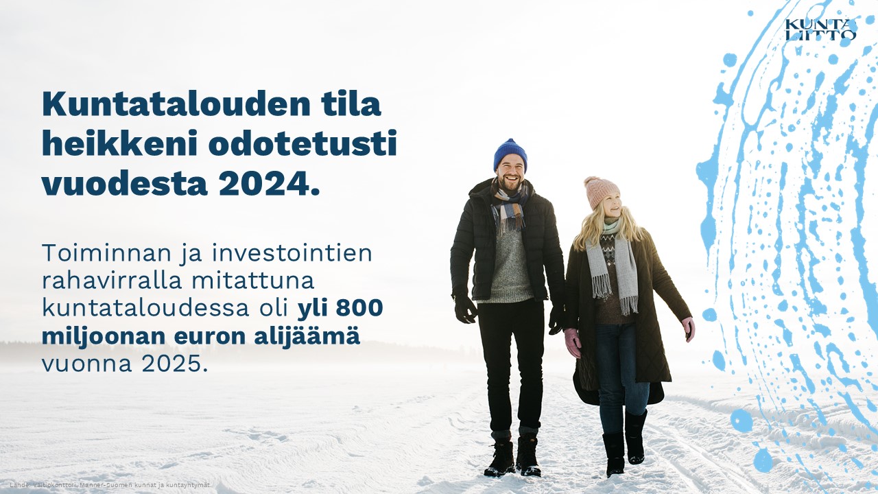 Kuntatalouden tila heikkeni odotetusti vuodesta 2024. Toiminnan ja investointien rahavirralla mitattuna kuntataloudessa oli yli 800 miljoonan euron alijäämä vuonna 2025, sillä kuntien kustannukset kasvoivat muun muassa TE-palvelu-uudistuksen myötä reippaasti. Talouden tilan heikkenemistä selittävät myös verotulojen aleneminen sekä valtionosuuksien leikkaukset. Tiedot käyvät ilmi kuntatalouden tilaa vuonna 2025 arvioivasta Kuntaliiton tilinpäätösanalyysistä.