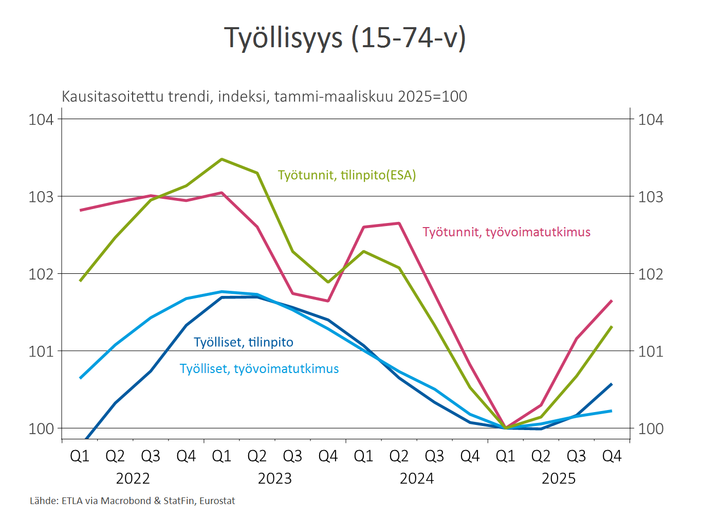 Työllisyys alkoi kasvaa tämän hetken tilastohistorian mukaan keväällä, mutta tuotannon käänne vasta loppuvuodesta. Kausitasoitetun trendin perusteella työtunteja tehtiin vuoden viimeisellä neljänneksellä reilu prosentti enemmän kuin vuoden ensimmäisellä neljänneksellä (kuvio 1). Työllisten henkilöidenkin lukumäärä oli joitain prosentin kymmenyksiä korkeammalla vuoden ensimmäiseen neljännekseen verrattuna.