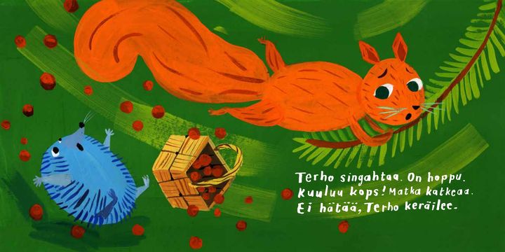 Terho on ketterä pieni oravanpoikanen, jolla on hoppu! Hän kiipeää ja kipittää, loikkii ja tarpoo. Matka keskeytyy tuon tuostakin erilaisiin esteisiin, kommelluksiin tai apua tarvitsevien ystävien kohtaamisiin. Terho keksii aina ratkaisut, ja matka jatkuu. Mutta mihin Terholla on hoppu?