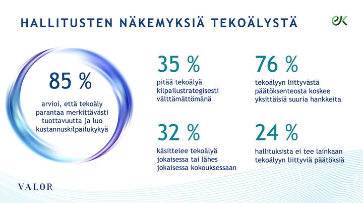 Liikkeenjohdon konsulttiyritys VALOR Partners selvitti yhteistyössä Elinkeinoelämän keskusliitto EK:n kanssa suomalaisten suuryritysten hallitusten näkemyksiä tekoälystä. Valtaosa (85 %) haastatelluista näkee tekoälyn ensisijaisesti tuottavuuden ja tehokkuuden lähteenä, ei kasvun moottorina. Tekoälyn käsittelytavat hallituksissa vaihtelevat, ja osassa yrityksiä tekoäly on jo jatkuvasti hallituksen agendalla.
