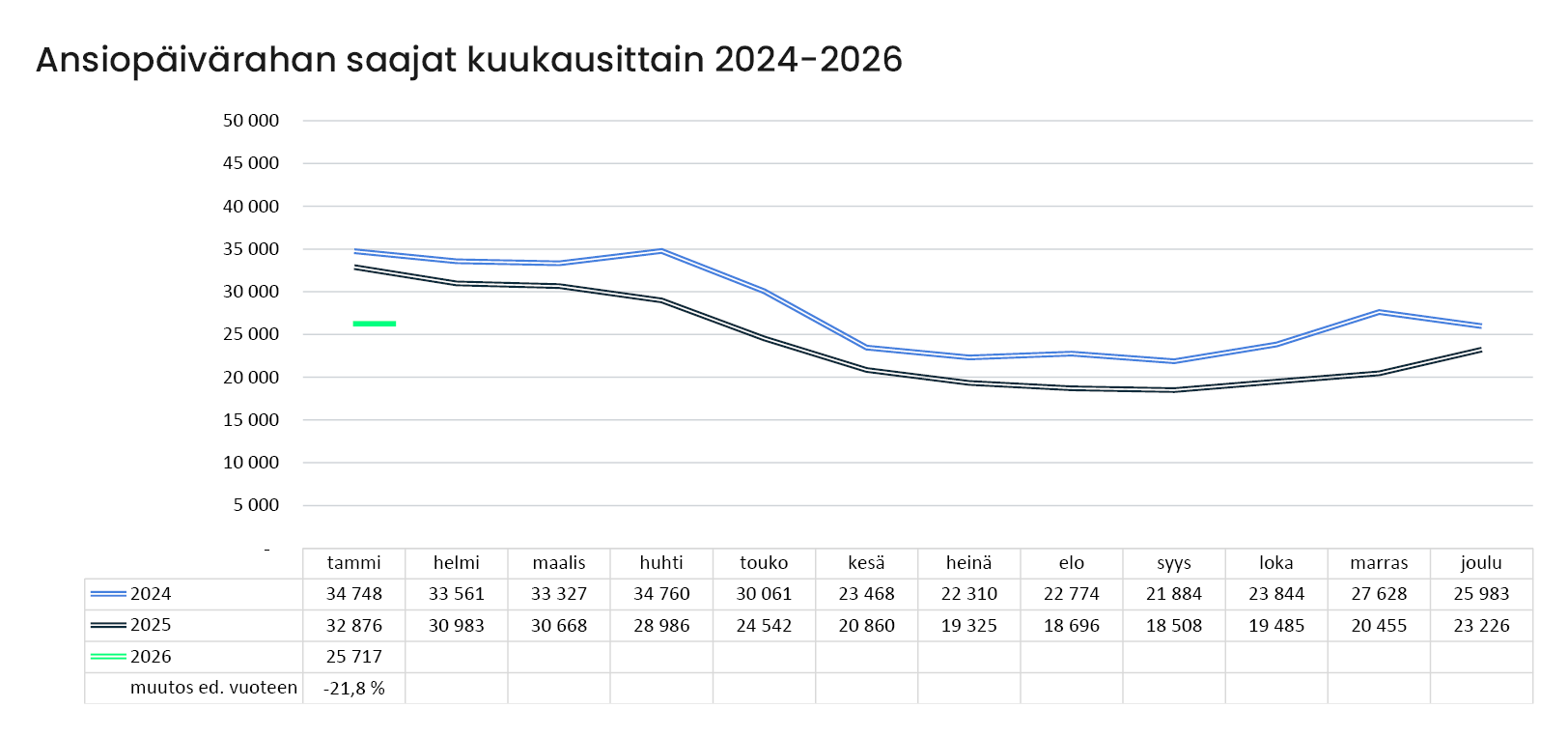 Ansiopäivärahaa maksettiin tammikuussa yhteensä 32,6 miljoonaa euroa. Summa kasvoi joulukuusta 7,2 prosenttia (30,4 M€), mutta oli 34,3 prosenttia pienempi kuin vuotta aiemmin (49,6 M€).