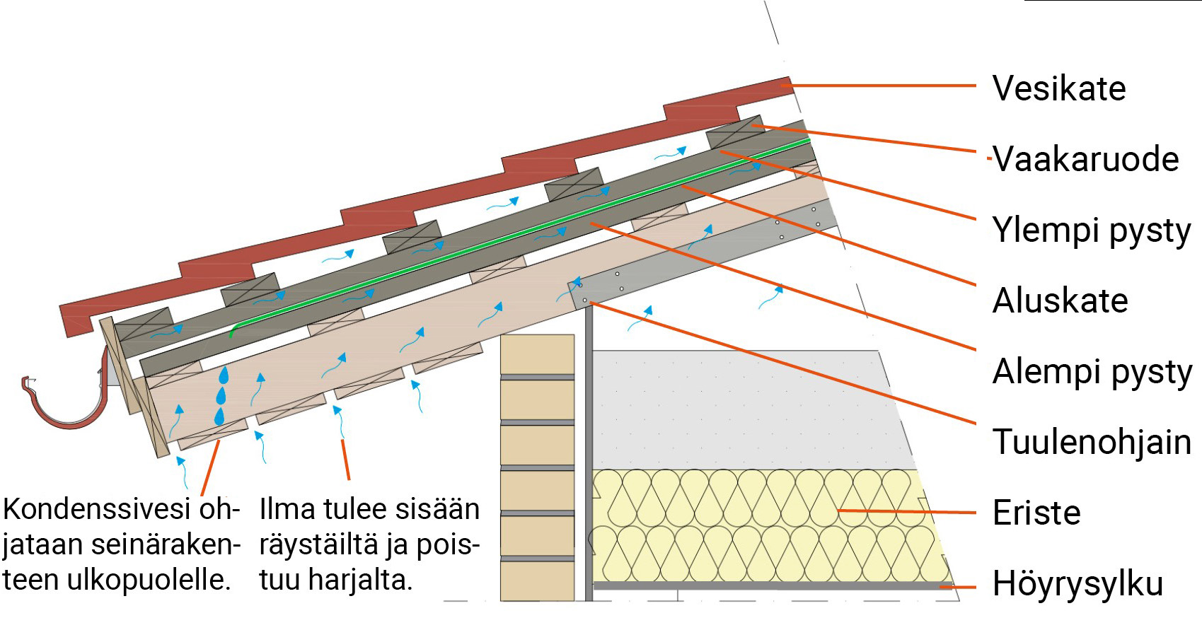 "Tuulettuvaan kattorakenteeseen kuuluu tärkeänä osana kunnollinen aluskate, joka kerää kosteuden ja ohjaa sen ulkoilmaan. Ilman pitää päästä kiertämään sekä aluskatteen alla että päällä. Vesivek käyttää kattoremonteissaan tätä niin sanottua tuplatuuletusrakennetta. Joskus tarvitaan kolmois- tai jopa neloistuuletusrakenne, jotta varmistetaan riittävä ilmankierto", Bau kertoo.