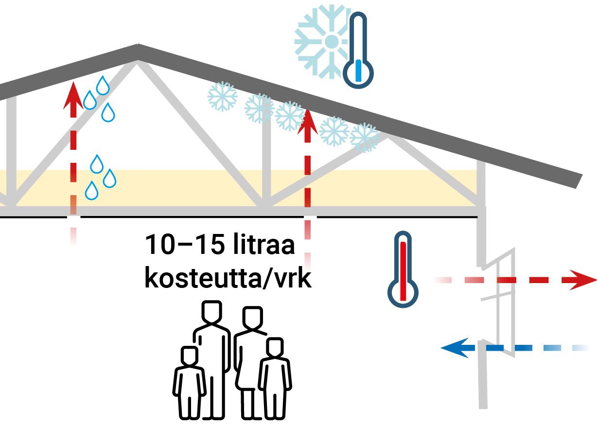 Asumisessa syntyy jatkuvasti vesihöyryä: hengityksestä, suihkusta, ruoanlaitosta ja pyykinkuivauksesta. Keskimäärin nelihenkinen perhe tuottaa huoneilmaan kosteutta 10–15 litraa vuorokaudessa. Lämmin ja kostea sisäilma pyrkii kevyempänä nousemaan ylöspäin. Jos höyryn- tai ilmansulussa on pieniäkin reikiä, kosteus löytää tiensä yläpohjaan.