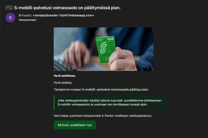 Toinen viime viikkojen erityisen aktiivinen huijaus tehdään S-Pankin nimissä. Huijausviestissä vedotaan palvelun jatkuvuuteen: