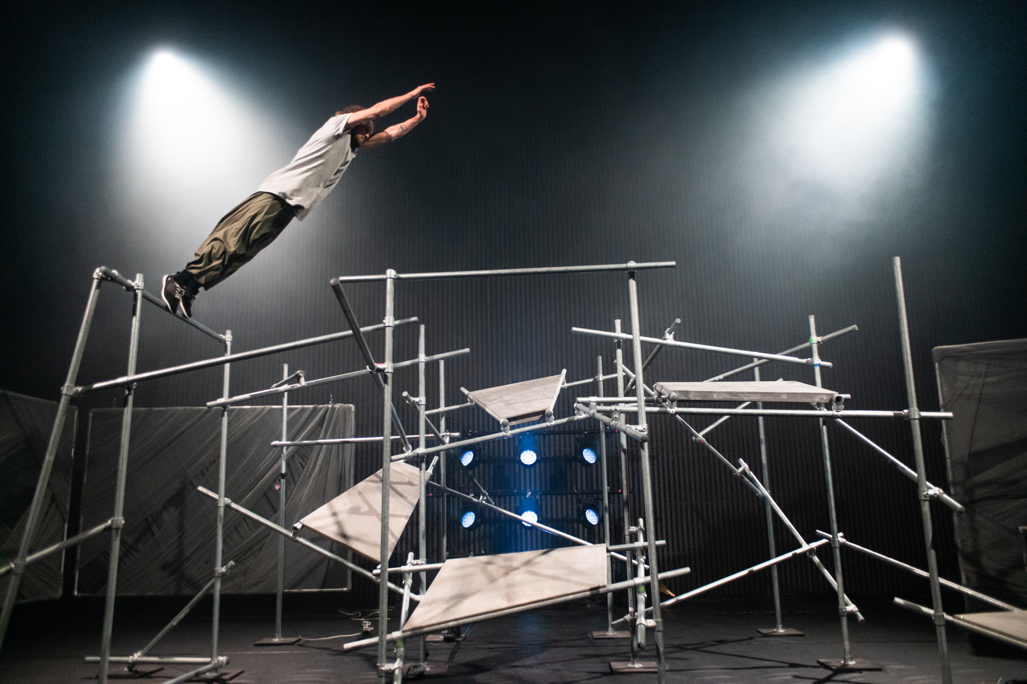 I norska HeinCos verk Uventa (det oväntade) utmanar två parkourutövare tyngdkraften och varandra på en konstruktion av enorma metallrör.